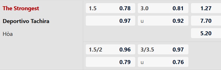 The Strongest xếp ở cửa trên với mức chấp khá sâu 1 1/2 bàn, cho thấy niềm tin lớn vào lợi thế sân nhà của đội bóng Bolivia. Dù phong độ tổng thể chưa thật sự thuyết phục, The Strongest thường chơi bùng nổ khi đá các trận cúp trên sân nhà. Tuy nhiên, với một Deportivo Tachira đang có phong độ ổn định và không dễ vỡ trận, lựa chọn đội khách ở kèo châu Á có thể là phương án an toàn hơn, nhất là trong bối cảnh đây mới chỉ là lượt đi.