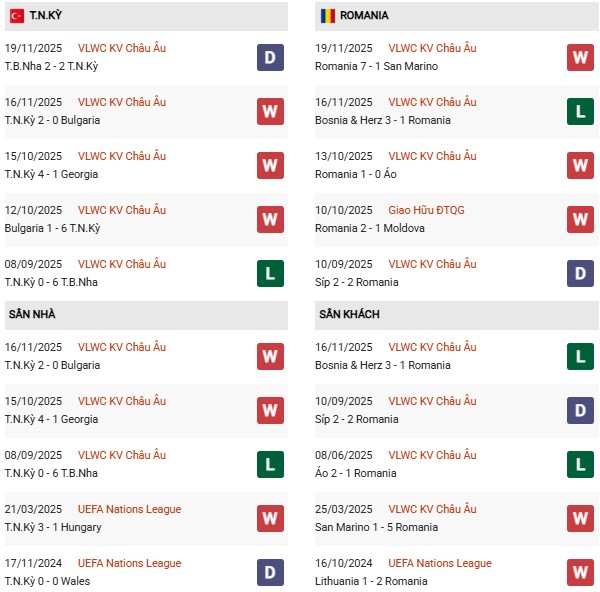 Thống kê phong độ Thổ Nhĩ Kỳ vs Romania: