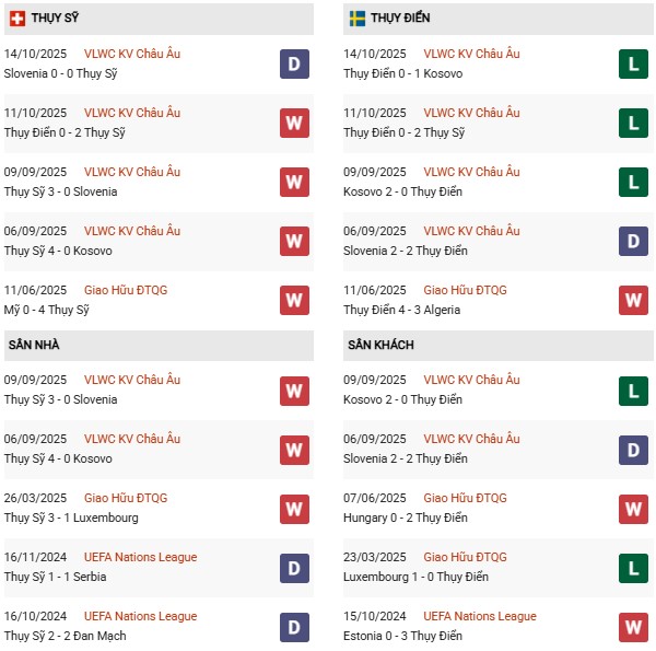 Thống kê phong độ Thụy Sĩ vs Thụy Điển: