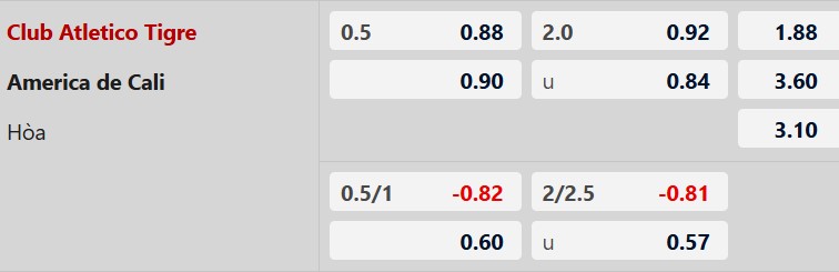 Thông tin tỷ lệ Tigre vs America de Cali: