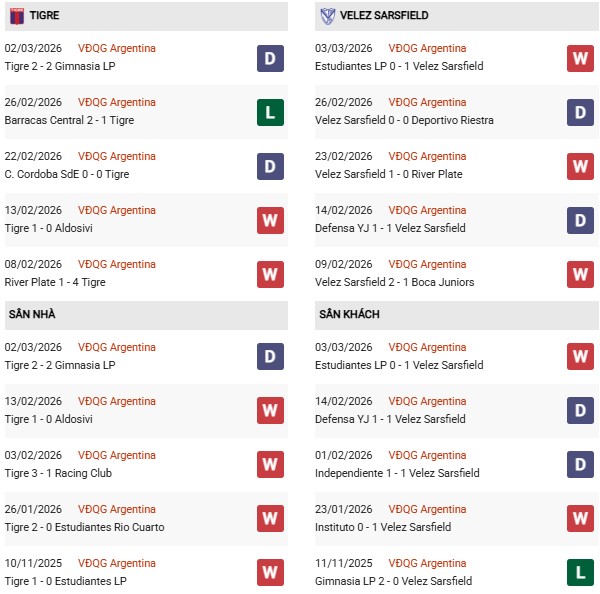 Thống kê phong độ Tigre vs Velez Sarsfield:
