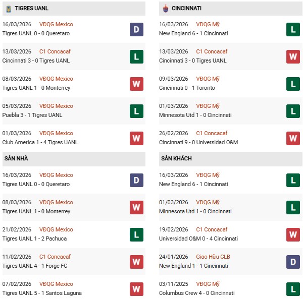 Thống kê phong độ Tigres UANL vs Cincinnati:
