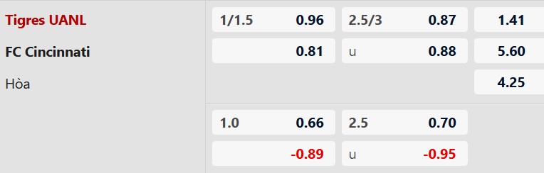 Thông tin tỷ lệ kèo Tigres UANL vs Cincinnati:
