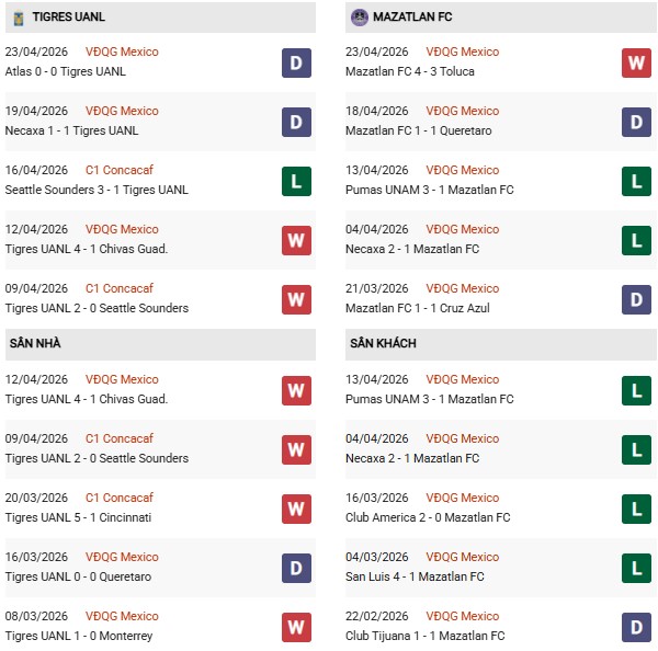 - Trên sân nhà, Tigres UANL thắng 3, thua 2 trước Mazatlan.