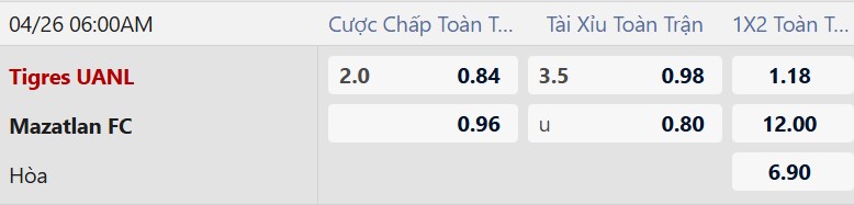 Thông tin tỷ lệ cược Tigres UANL vs Mazatlan: