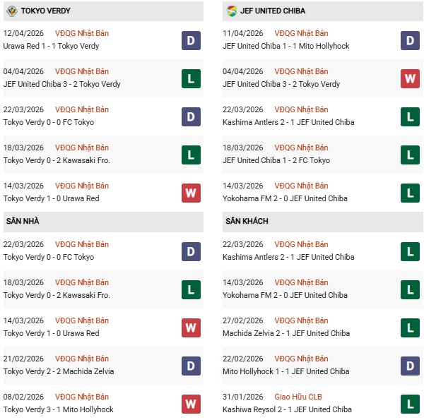 Thống kê phong độ Tokyo Verdy vs JEF United: