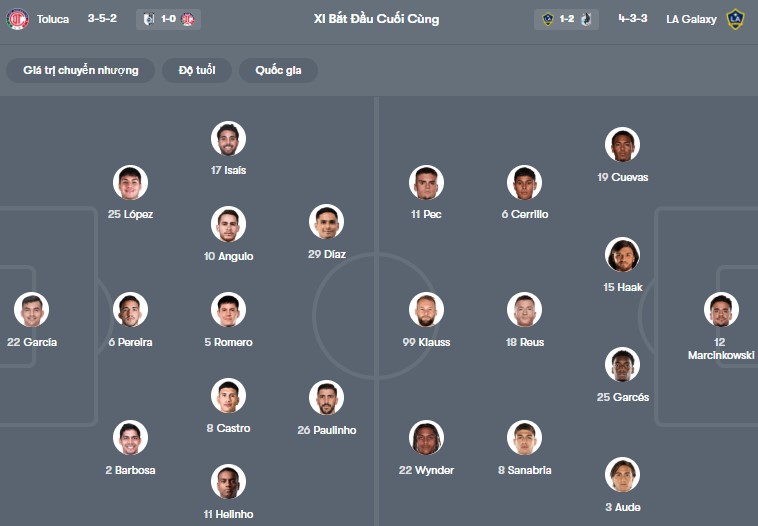 Đội hình dự kiến Toluca vs LA Galaxy: