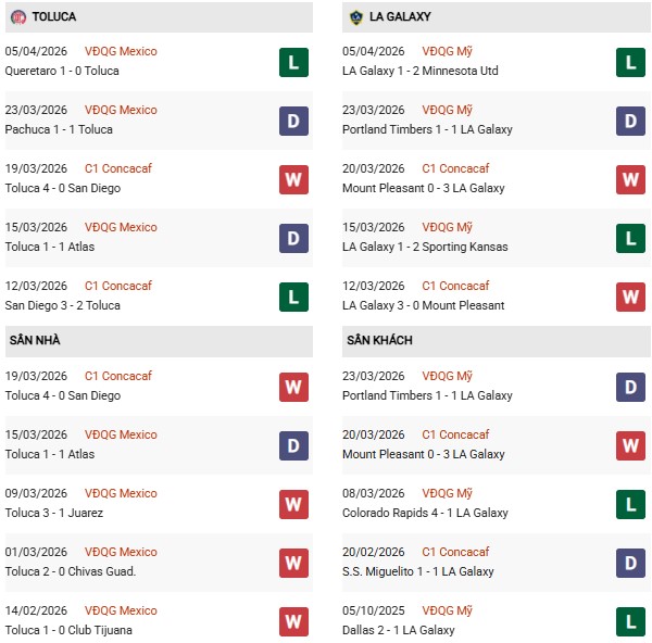Thống kê phong độ Toluca vs LA Galaxy:
