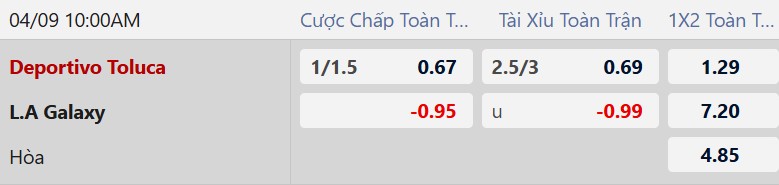 Thông tin tỷ lệ kèo Toluca vs LA Galaxy: