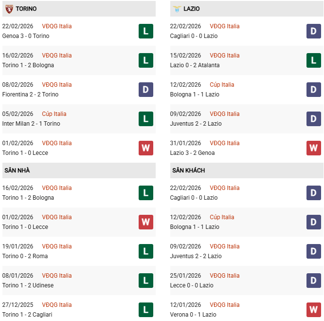 Thống kê phong độ Torino vs Lazio: