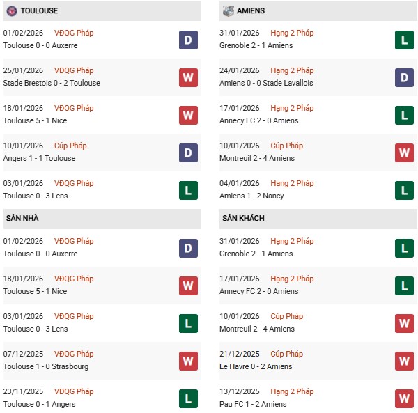 - Trên sân nhà, Toulouse thắng 4, thua 1 trước Amiens.