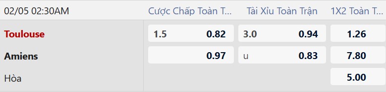 Thông tin tỷ lệ cược Toulouse vs Amiens: