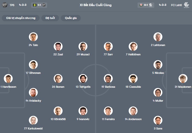 Đội hình dự kiến TPS Turku vs Lahti: