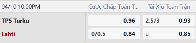 Thông tin tỷ lệ kèo TPS Turku vs Lahti: