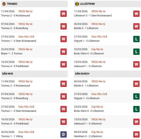 - Tromso thắng 4, hòa 5, thua 1 trong 10 trận gặp Lillestrom gần đây.
