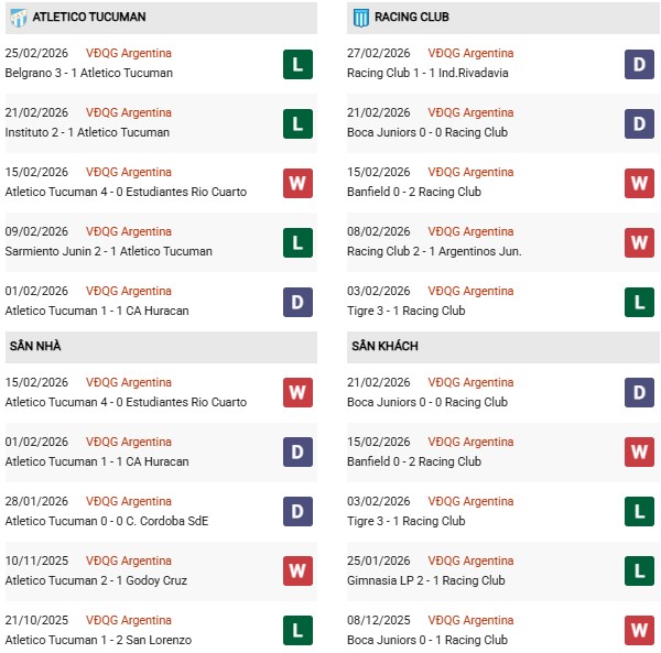 Thống kê phong độ Tucuman vs Racing Club: