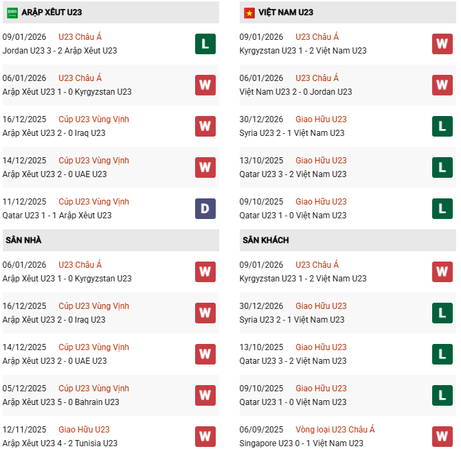 Thống kê phong độ U23 Saudi Arabia vs U23 Việt Nam: