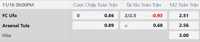 Thông tin tỷ lệ kèo Ufa vs Arsenal Tula: