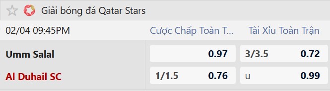 Thông tin tỷ lệ kèo Umm Salal vs Al Duhail: