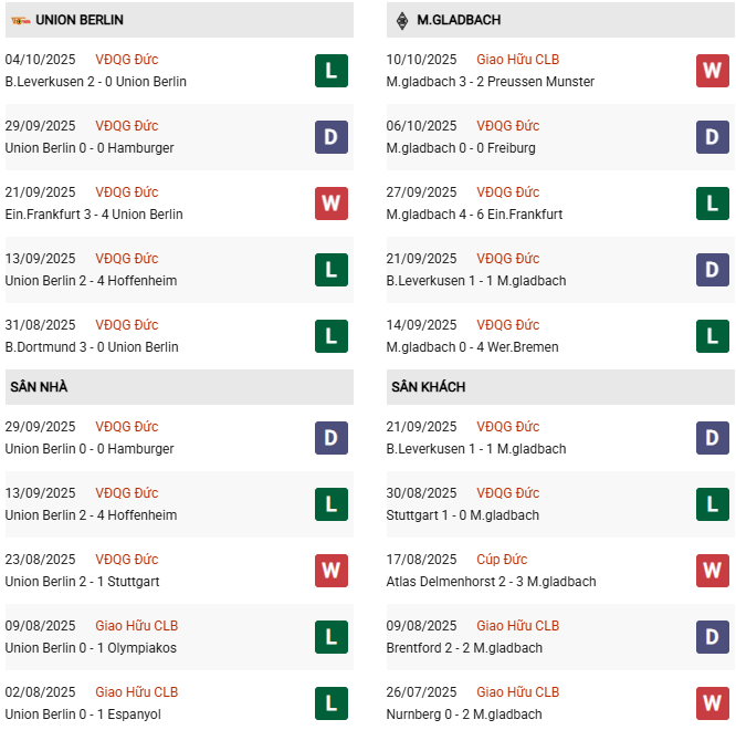 - Union Berlin thắng 5, hòa 3, thua 2 trong 10 trận gặp M'gladbach gần đây.