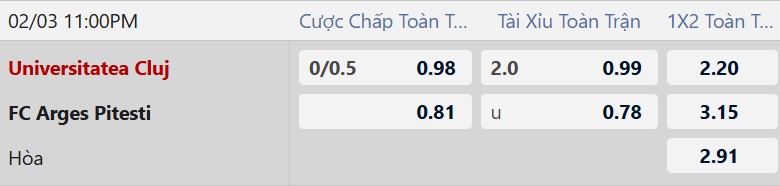 Thông tin tỷ lệ cược Universitatea Cluj vs Arges: