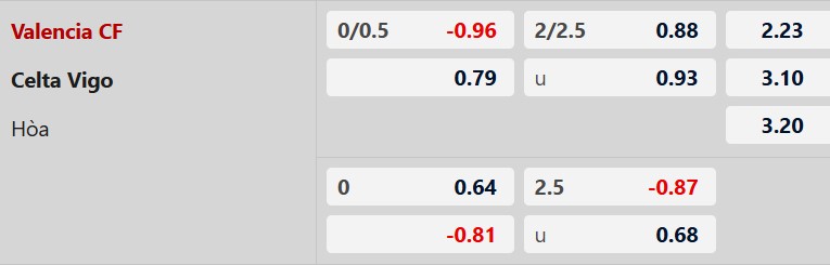 Thông tin tỷ lệ bóng đá Valencia vs Celta Vigo: