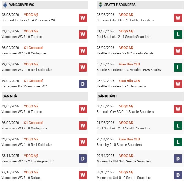 Thống kê phong độ Vancouver vs Seattle Sounders: