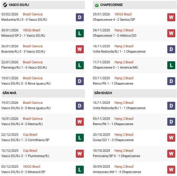 - Vasco da Gama thắng 2, hòa 6, thua 2 trong 10 trận gặp Chapecoense gần đây.