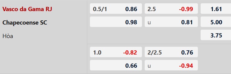 Thông tin tỷ lệ Vasco da Gama vs Chapecoense: