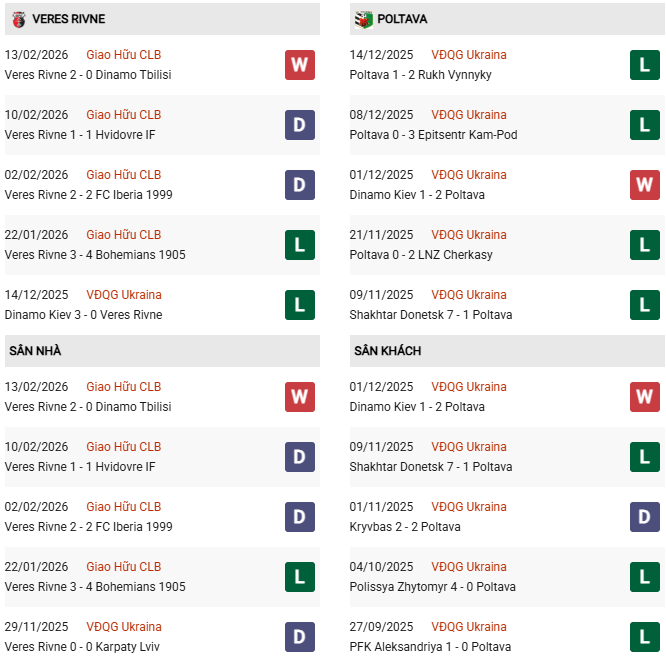 Thống kê phong độ Veres Rivne vs Poltava: