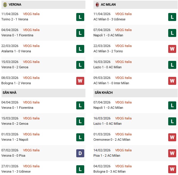 Thống kê phong độ Verona vs AC Milan: