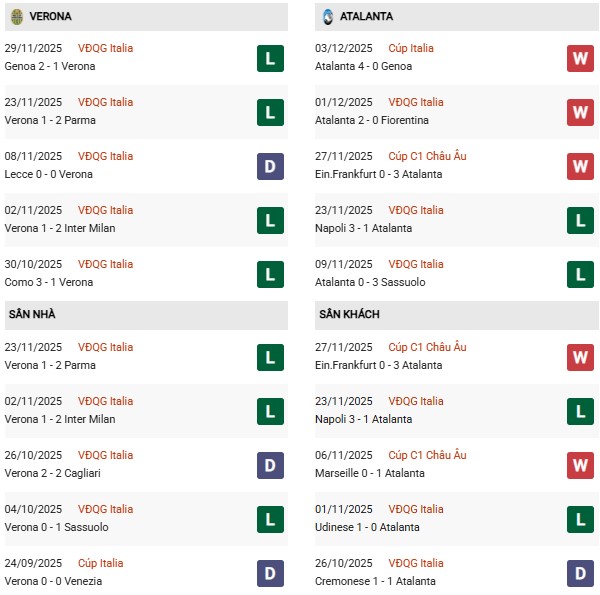 Thống kê phong độ Verona vs Atalanta: