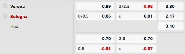 Thông tin tỷ lệ kèo Verona vs Bologna: