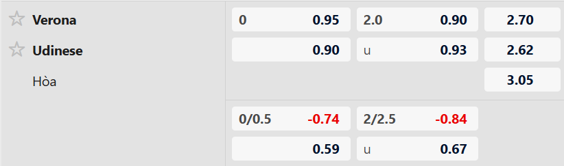 Thông tin tỷ lệ kèo Verona vs Udinese: