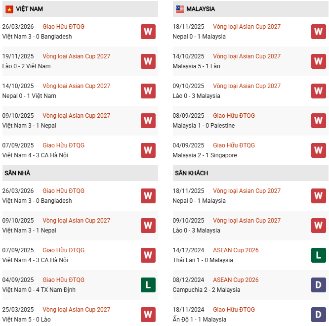 Thống kê phong độ Việt Nam vs Malaysia: