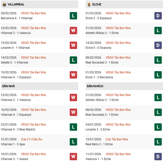 - Villarreal thắng 4, hòa 4, thua 2 trong 10 trận găph Elche gần đây.