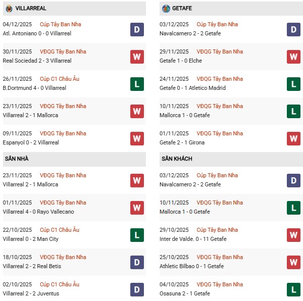 Thống kê phong độ Villarreal vs Getafe: