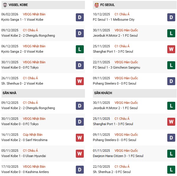Thống kê phong độ Vissel Kobe vs FC Seoul: