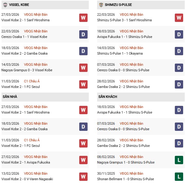 Thống kê phong độ Vissel Kobe vs Shimizu: