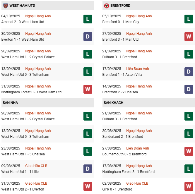 Thống kê phong độ West Ham vs Brentford: