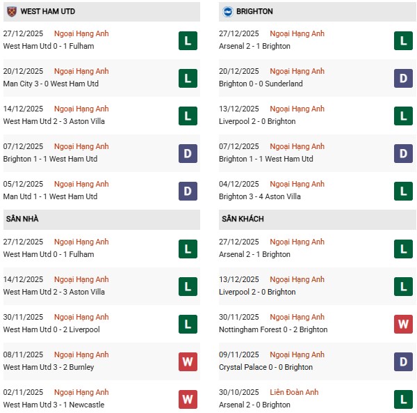 - Trên sân nhà, West Ham thắng 2, thua 2 trước Brighton.