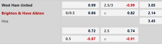 Thông tin tỷ lệ bóng đá West Ham vs Brighton:
