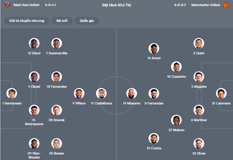 Đội hình dự kiến West Ham vs MU: