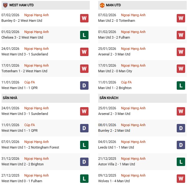 Thành tích đối đầu West Ham vs MU: