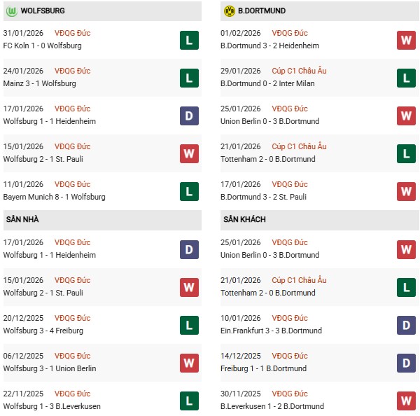 Thống kê phong độ Wolfsburg vs Dortmund: