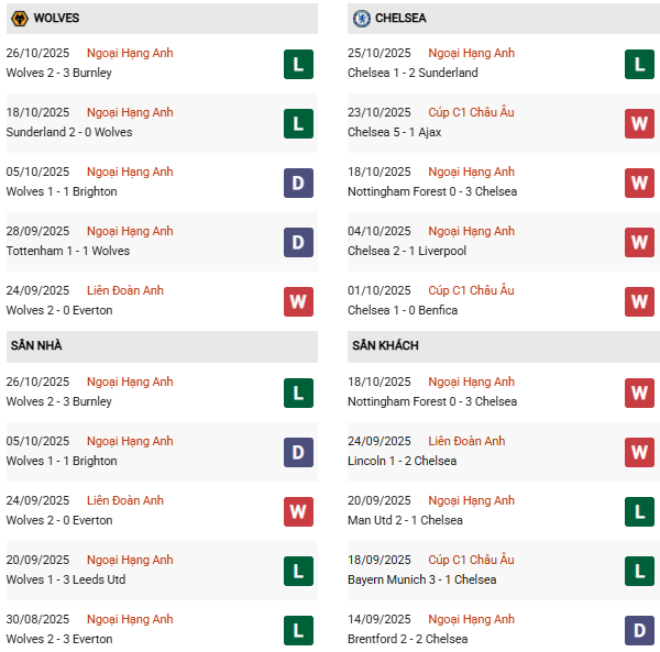 Thống kê cũng chỉ ra rằng Bầy sói không hề dễ bị bắt nạt mỗi khi chạm trán Chelsea. Trong 5 lần chạm trán gần nhất trên mọi đấu trường, họ thắng 3 trận. Tuy nhiên, 2 lần đối đầu gần đây nhất đều chứng kiến Chelsea áp đảo: thắng 6-2 tại Molineux hồi tháng 8/2024 và 3-1 trên sân Stamford Bridge hồi tháng 1/2025.