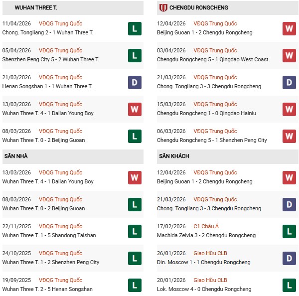 - Wuhan Three Towns thắng 2, hòa 4, thua 4 trong 10 trận gặp Chengdu gần đây.
