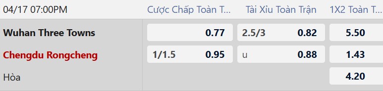 Thông tin tỷ lệ cược Wuhan Three Towns vs Chengdu: