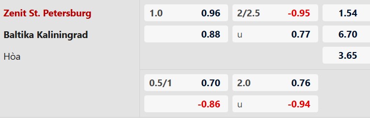 Thông tin tỷ lệ bóng đá Zenit vs Baltika: