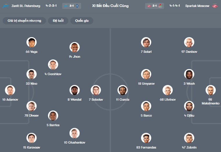 Đội hình dự kiến Zenit vs Spartak Moscow: